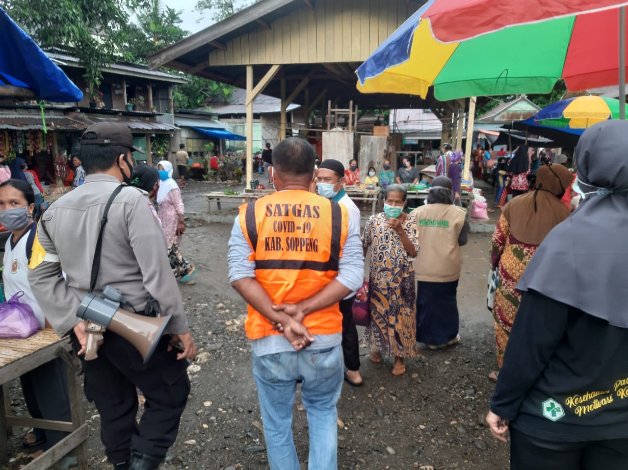 Marioritenga, Soppeng – (06/07/2020) Tim Satgas Covid-19 PKM Goarie tengah gencar melakukan sosialisasi wajib masker dan pembinaan di tempat-tempat umum terkait protokol kesehatan demi mencegah penularan Covid-19. Kegiatan ini juga sejalan dengan Peraturan Bupati Soppeng No. 31 Tahun 2020 tentang Kabupaten Wajib Masker.
